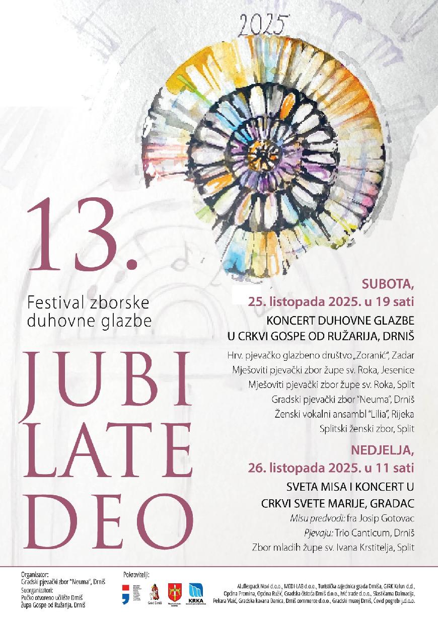 Zadnjeg listopadskog vikenda, točnije 25. i 26. listopada 2025., u Drnišu i Gradcu je održan 13. Festival zborske duhovne glazbe „Jubilate Deo“. Dvodnevna manifestacija koja je u glazbenom smislu postala jedan od drniških zaštitnih znakova, i ove je godine privukla veliki broj publike i izvođača.
